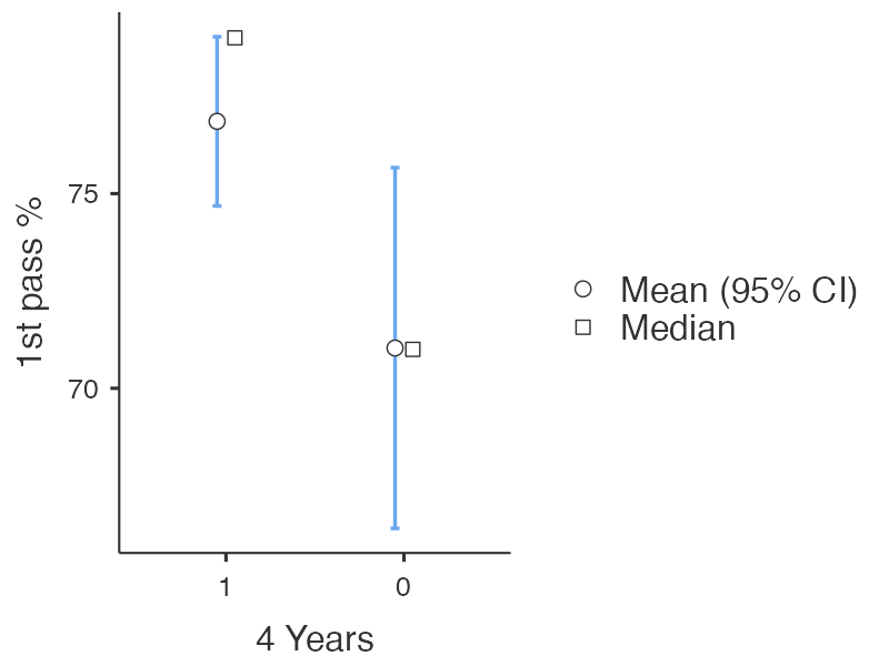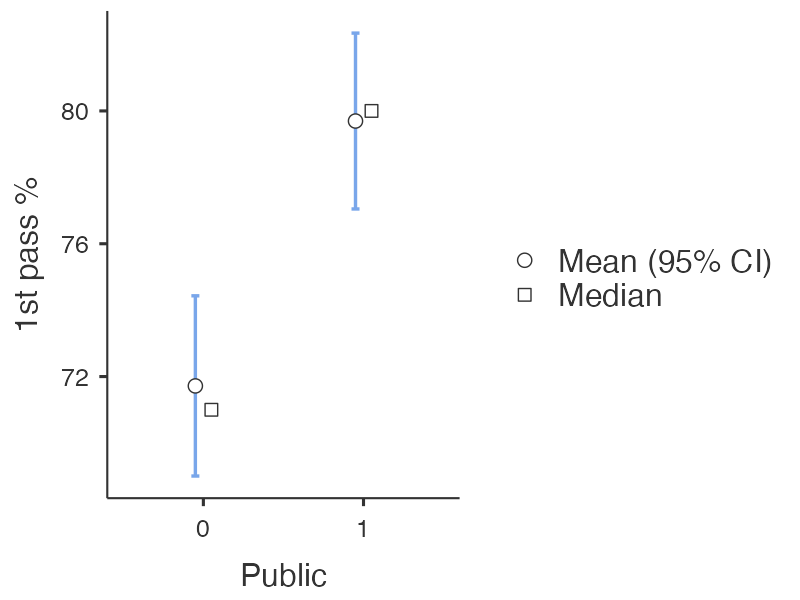 Some other interesting insights with the binary data: public institutions have a higher mean pass score relative to private institutions (80% vs. 72%, p<0.001) and 4-year programs have a higher mean pass score than other types of program lengths (77% vs. 71%, p=0.02).