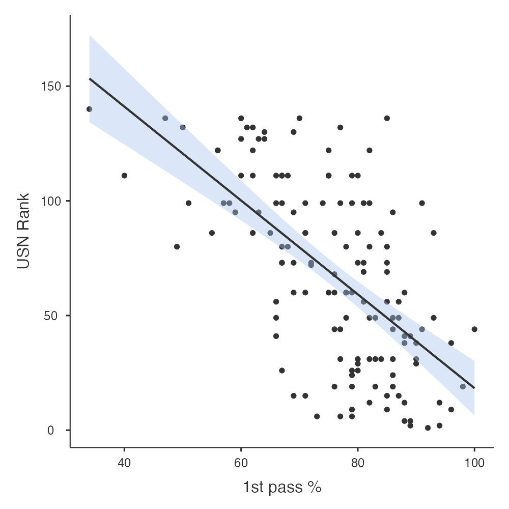 I thought it might be fun to just explore some scatter plots and descriptive statistics. Right off the bat, it looks like there might be some correlation between a lower US News ranking (higher number) and lower pass rates.
