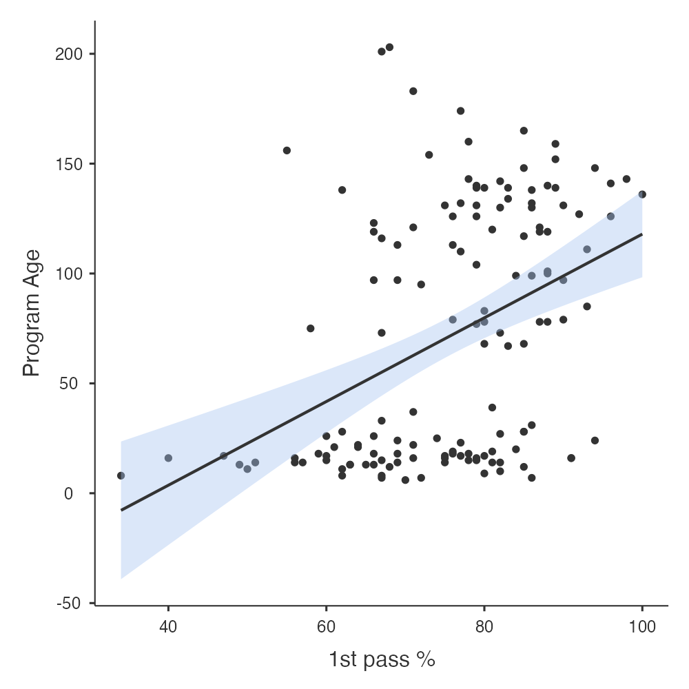 Next, I looked at the program age. There also appears to be some correlation between the age of the program (with older programs being a higher number) and first time pass rate.